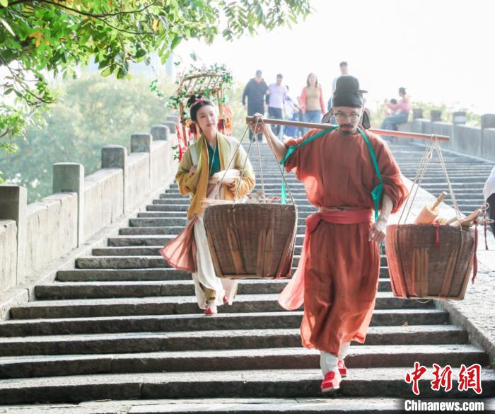 【“国风大运河”:文化交流 “送花姑娘”揽收杭州文化特产北上】 在起航地杭州,国风博主杭州“送花姑娘”陈喜悦是“千年运河千里行”文化漕运的船员之一,她身着古装,背着竹篓,后面跟着挑着担子的伙伴,走过杭州大运河的标志——拱宸桥,吸引了众人的眼球。在这次“千年运河千里行”活动中,文化名人、摄影大咖、杭州市世界遗产金牌文化特使、外国友人、国风博主、媒体等,将一同开启一段新时代文化漕运之旅。(图片来源:本文图片除标注外均综编自中新网发/主办方供图)