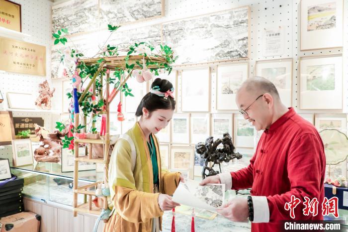 在桥西历史文化街区,百年老店方回春的膏方香囊,网红书店晓风的文创丝巾,运河画家吴理人的作品都被她收进背篓,在“千年运河千里行”文化漕运终点——北京通州漕运码头,她将向北京市民游客赠送来自杭州的伴手礼。图为国风博主杭州“送花姑娘”陈喜悦从吴理人手上接过运河画作,准备带去北京。