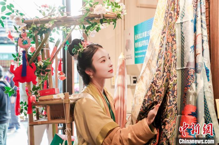 在嘉兴,采风团“走读”月河历史街区,寻访运河人家;在镇江,将坐船横渡万里长江,体验“京口瓜洲一水间”;在扬州,将开展运河文化交流活动,被誉为“西湖第十一景”的杭州西湖女子巡逻队将亮相瘦西湖,与扬州民众同框送惊喜;在北京,陈喜悦将向北京市民游客赠送来自杭州的伴手礼。图为“送花姑娘”在晓风书屋挑选杭州丝绸,准备带去北京。