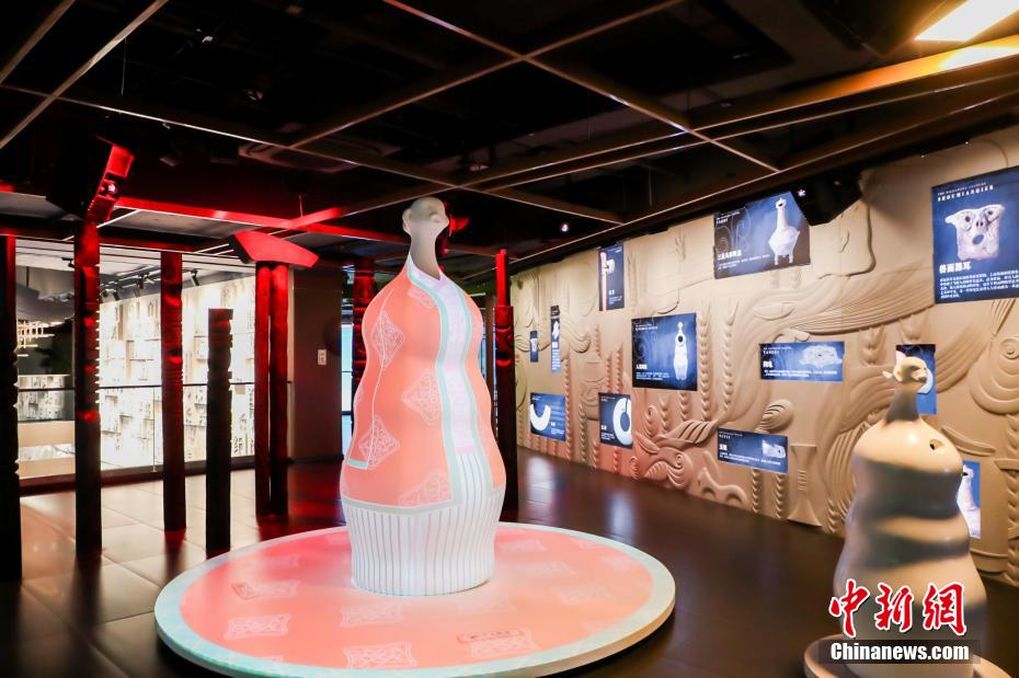 大运河数字诗路e站南湖体验中心的多媒体互动装置,以新石器时代遗址中出土的人首陶瓶造型为灵感,当游客靠近装置,人首陶瓶上会出现不同的传统服饰。