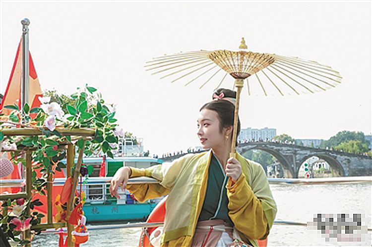 秋日暖阳下,这道大运河边的美丽风景,引发市民游客纷纷驻足。“送花姑娘”陈喜悦将带上杭州花纸伞、运河折扇、拱宸桥画作、香囊、丝绸、运河书籍以及杭州传统糕点等杭州文化特产北上,与运河沿线城市民众分享杭州江南文化。(图片来源:《杭州日报》发/杭州市商旅运河集团供图)