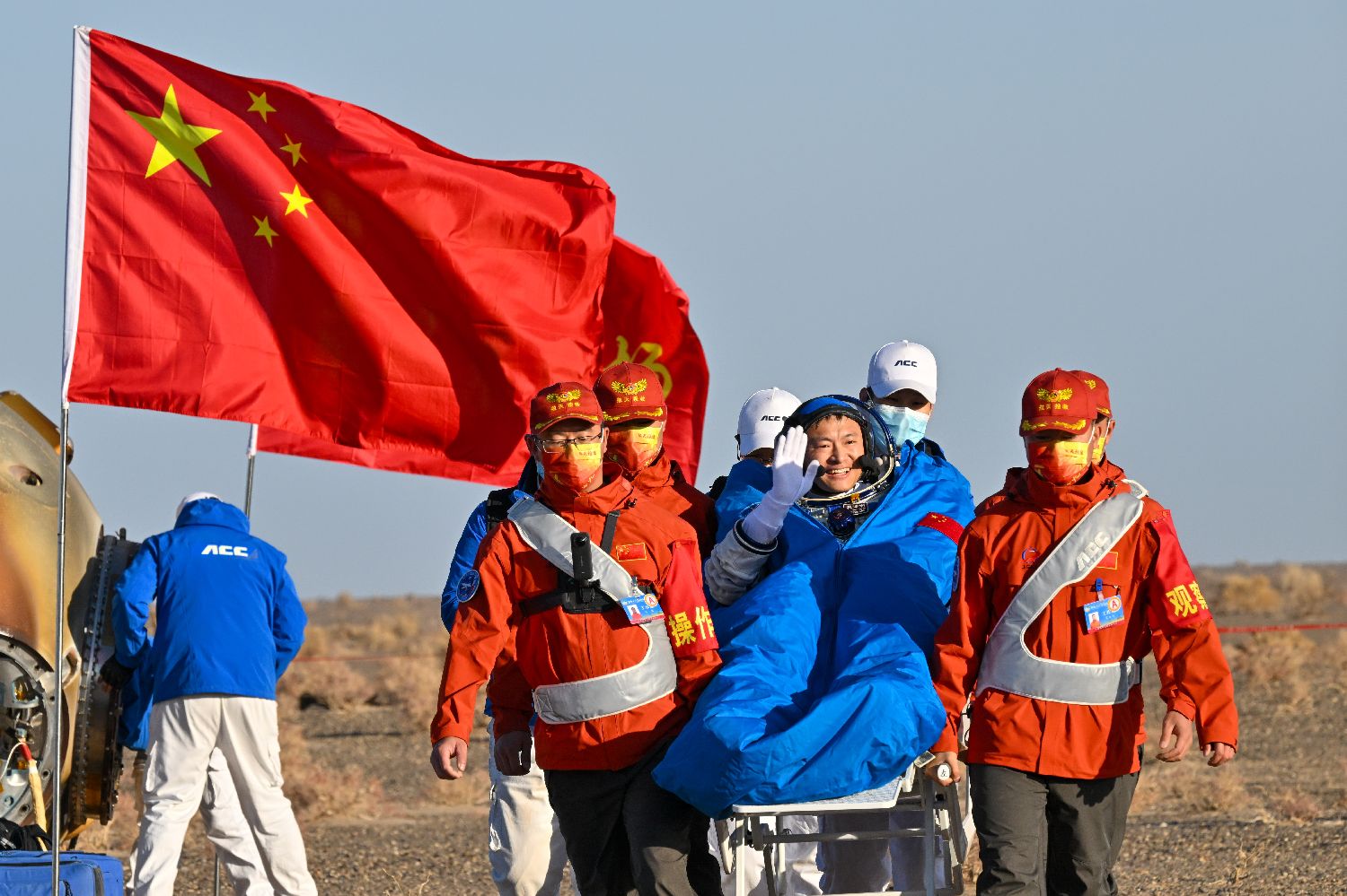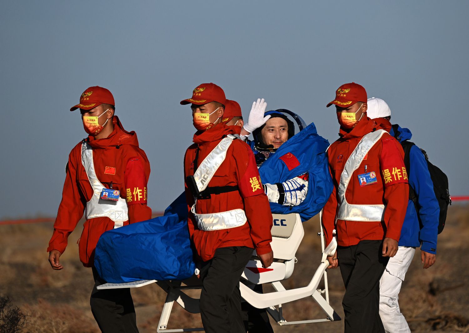 10月31日,神舟十六号载人飞船返回舱在东风着陆场成功着陆。这是航天员桂海潮安全顺利出舱。