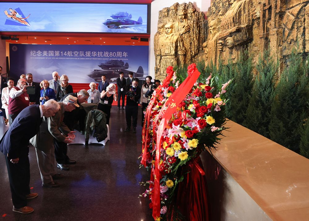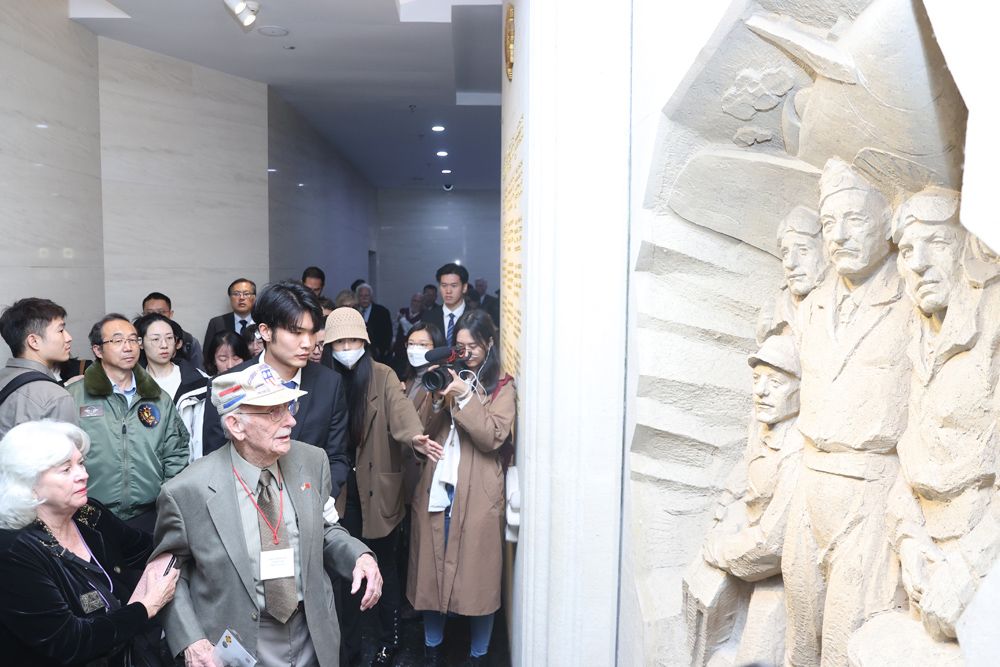 10月30日,地处北京卢沟桥附近的中国人民抗日战争纪念馆,迎来了特殊的客人——美国飞虎队老兵哈利·莫耶和梅尔文·麦克马伦一行。现年103岁的莫耶和98岁的麦克马伦此次携30余位飞虎队员的后人赴华访问。在抵京游览长城后的第二天,飞虎队老兵及家人一行马不停蹄去到中国人民抗日战争纪念馆参访。(图片来源:本文图片均自中新社)