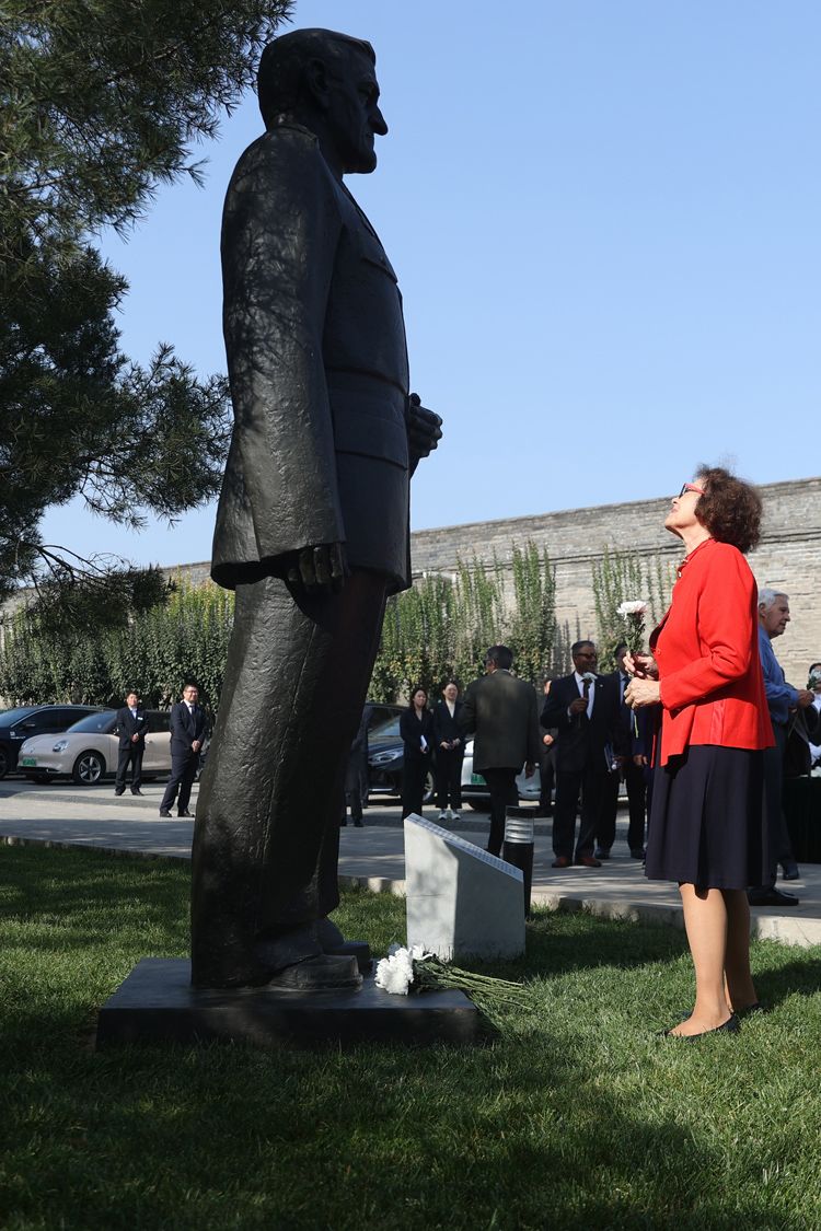 陈纳德将军的女儿陈美丽为父亲雕像鲜花。