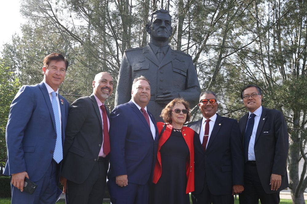 陈纳德将军的女儿陈美丽(右三)一行在陈纳德将军雕像前合影。