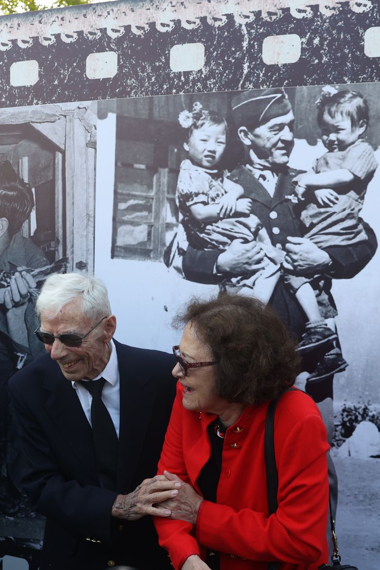 飞虎队老兵哈利·莫耶(左)与飞虎队创建人陈纳德的女儿陈美丽交流。