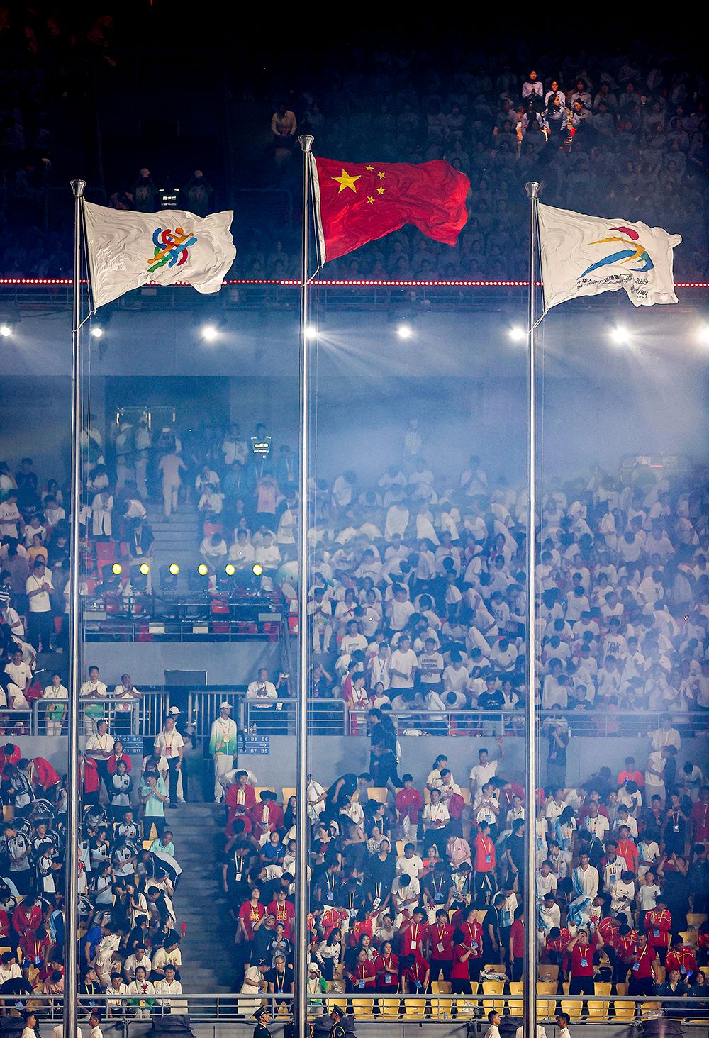 中华人民共和国国旗、中华人民共和国学生(青年)运动会会旗、中华人民共和国第一届学生(青年)运动会会旗在开幕式上升起。