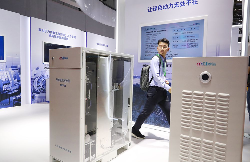 参观者从第六届进博会东芝公司展出的甲醇氢能发电机展品旁走过。(图片来源:本文图片均据新华社)