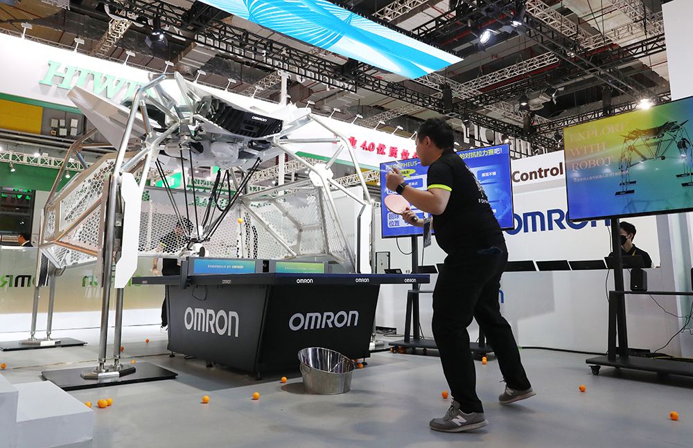 工作人员(右)在第六届进博会上展示欧姆龙公司展出的第八代FORPHEUS乒乓球教练机器人。