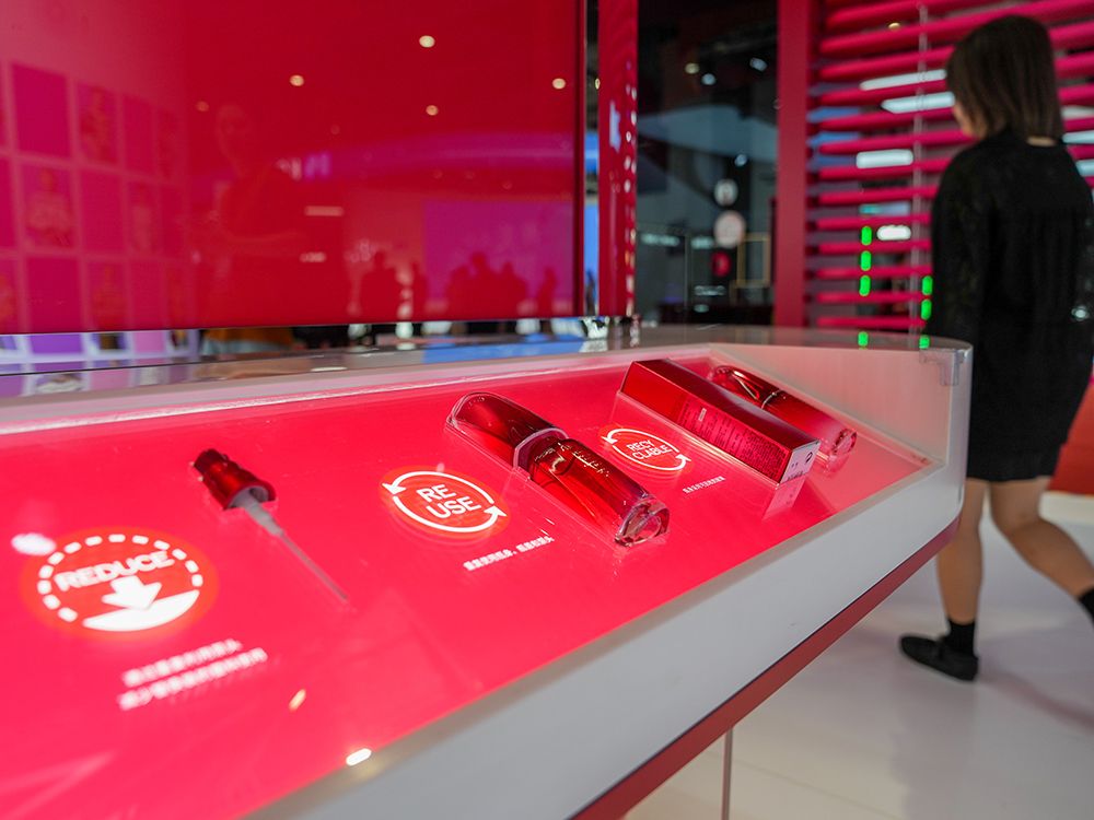 在第六届进博会消费品展区资生堂展台拍摄的红腰子空瓶。资生堂在进博会上首发首秀的“红腰子空瓶再续计划”,可让化妆品空瓶实现100%循环使用。