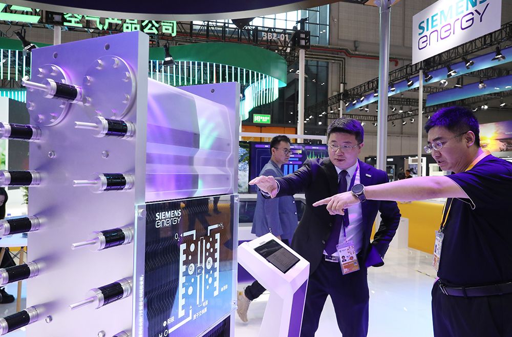 工作人员(左)介绍第六届进博会西门子公司展出的电解水制氢装置模型。
