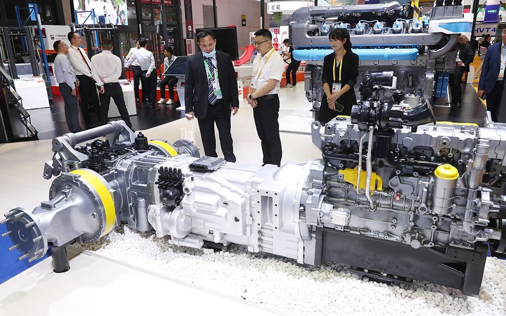 参观者在第六届进博会林德公司展出的的大马力拖拉机CVT动力总成系统模型展品旁交流。