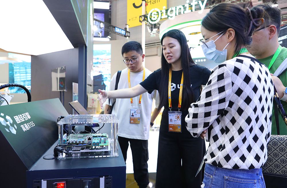 工作人员(左二)向参观者介绍Unity公司全新推出的团结引擎车机套件。