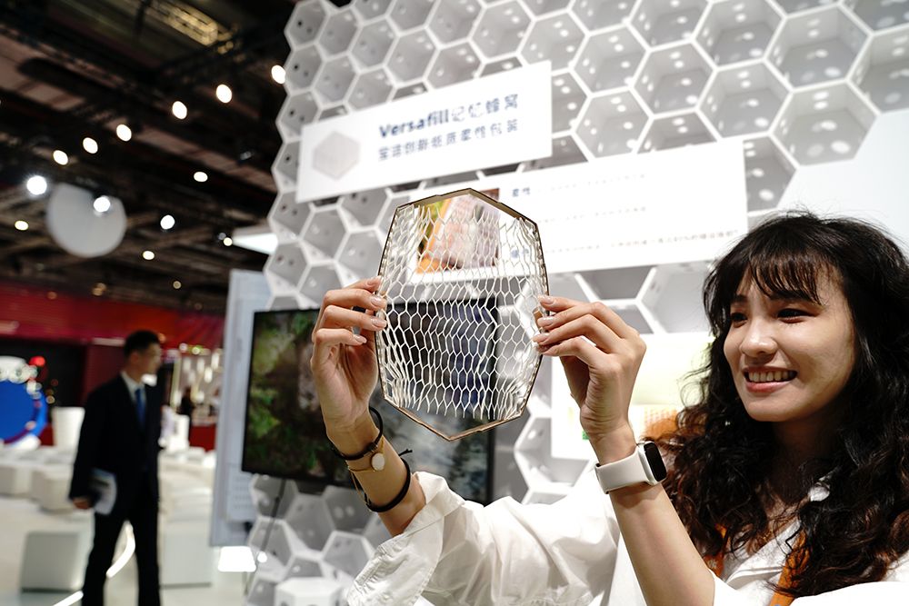 工作人员介绍全球首发的“记忆蜂窝”创新纸质柔性包装产品。
