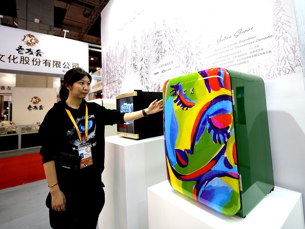 消费品展区HCK哈士奇冰吧展台,工作人员介绍首次展示的一款复古冰箱。