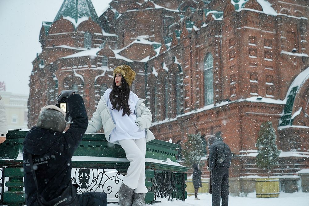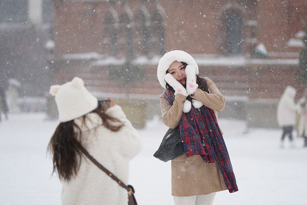 市民在索菲亚教堂前赏雪拍照。