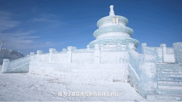 冰雪是大自然最质朴的馈赠。始于一滴水,凝成一块冰,厚爱一座城。松花江稳定的水流,为造就致密均匀通体透明的冰块创造了条件,也成就了无畏严寒的采冰人。春夏耕耘,魂牵黑土,秋冬收藏,魄动松江。昔日“当念阑干凿者苦,腊月深井汗如雨”,今时“号子声声响,撷萃采冰忙”。长达三千多年的采冰行业,如今早已成为了文化与艺术。切线、断冰、拉冰、装车,这些北国最纯朴的风景,经过采冰人之手,终化作建造银装世界的珠砖玉瓦。