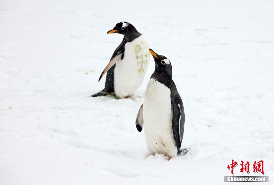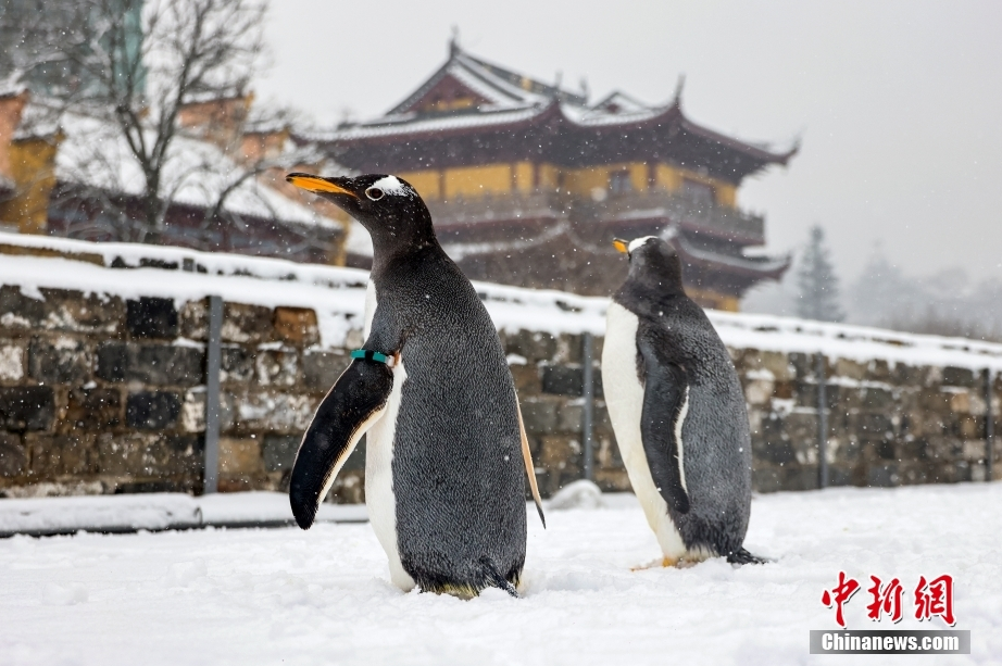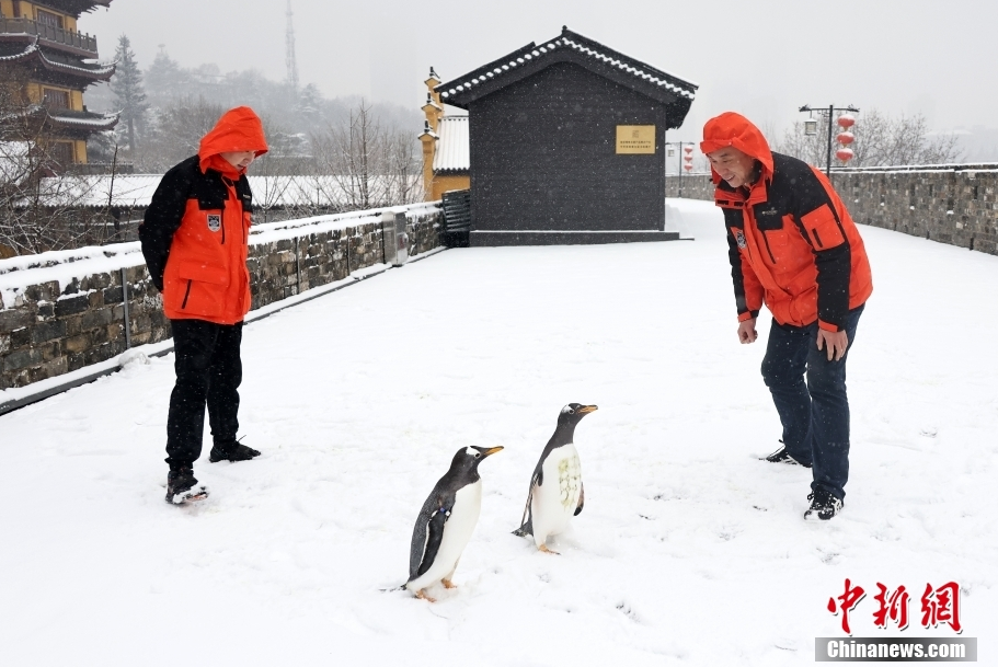 12月18日,在江苏南京,南京海底世界人工繁育的巴布亚企鹅“平平”和“安安”跟着饲养员登上明城墙解放门段,“赏”雪景拍大片。据了解,巴布亚企鹅是寒带企鹅,近日南京的天气对它们来说很适合户外活动。