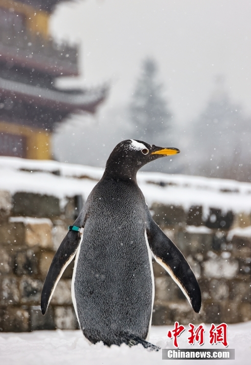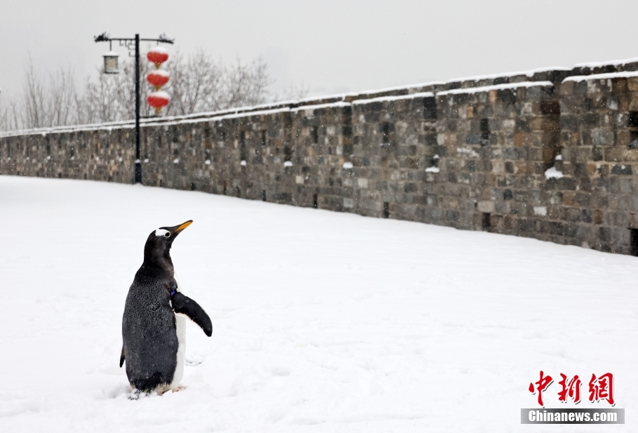 南京海底世界巴布亚企鹅登城墙“赏”雪景