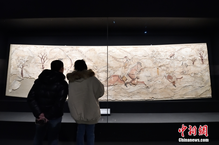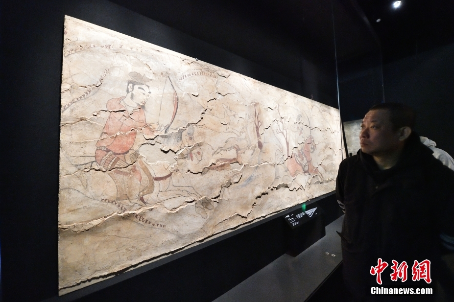 人们参观忻州九原岗北朝壁画墓出土《狩猎图》。(图片来源:本文图片均据中新网)