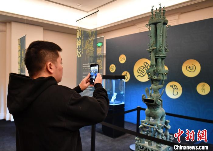 据了解,《哇呜!三星堆》借助中国科技的力量,为中华历史与文物还原真容,以此见证中华民族的生生不息,让游客感受珍宝重器背后的万古传奇。图为1月9日,游客在展厅内拍照留念。(图片来源:中新网)