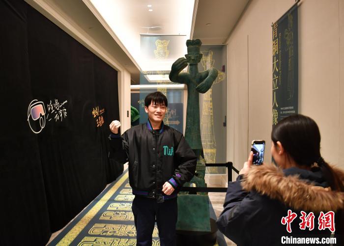 图为1月9日,游客与青铜大立人像合影留念。(图片来源:中新网)