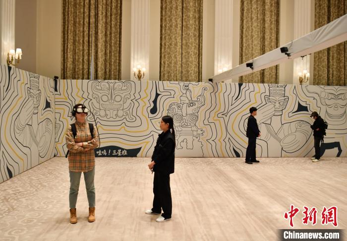 展区包含沉浸式VR展、文物展、影音区、文创区。在这里,三星堆文化不再是展柜中静止的文物和展板上的文字,游客可以通过戴上头显和背包,像穿越时空一般身临其境,跟随各具个性的虚拟角色一起漫游古蜀国。图为1月9日,游客穿戴VR设备体验沉浸式VR展。(图片来源:中新网)