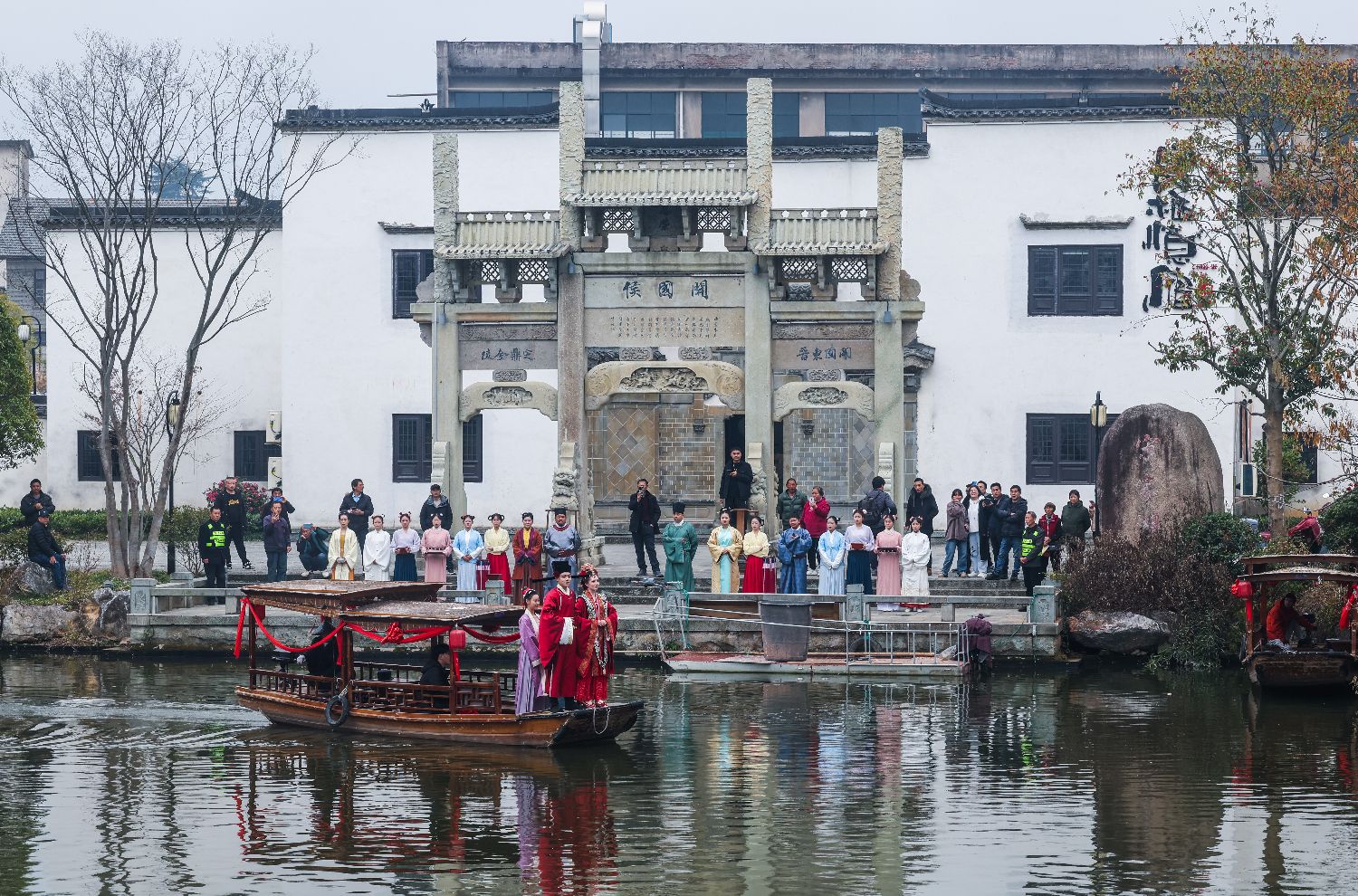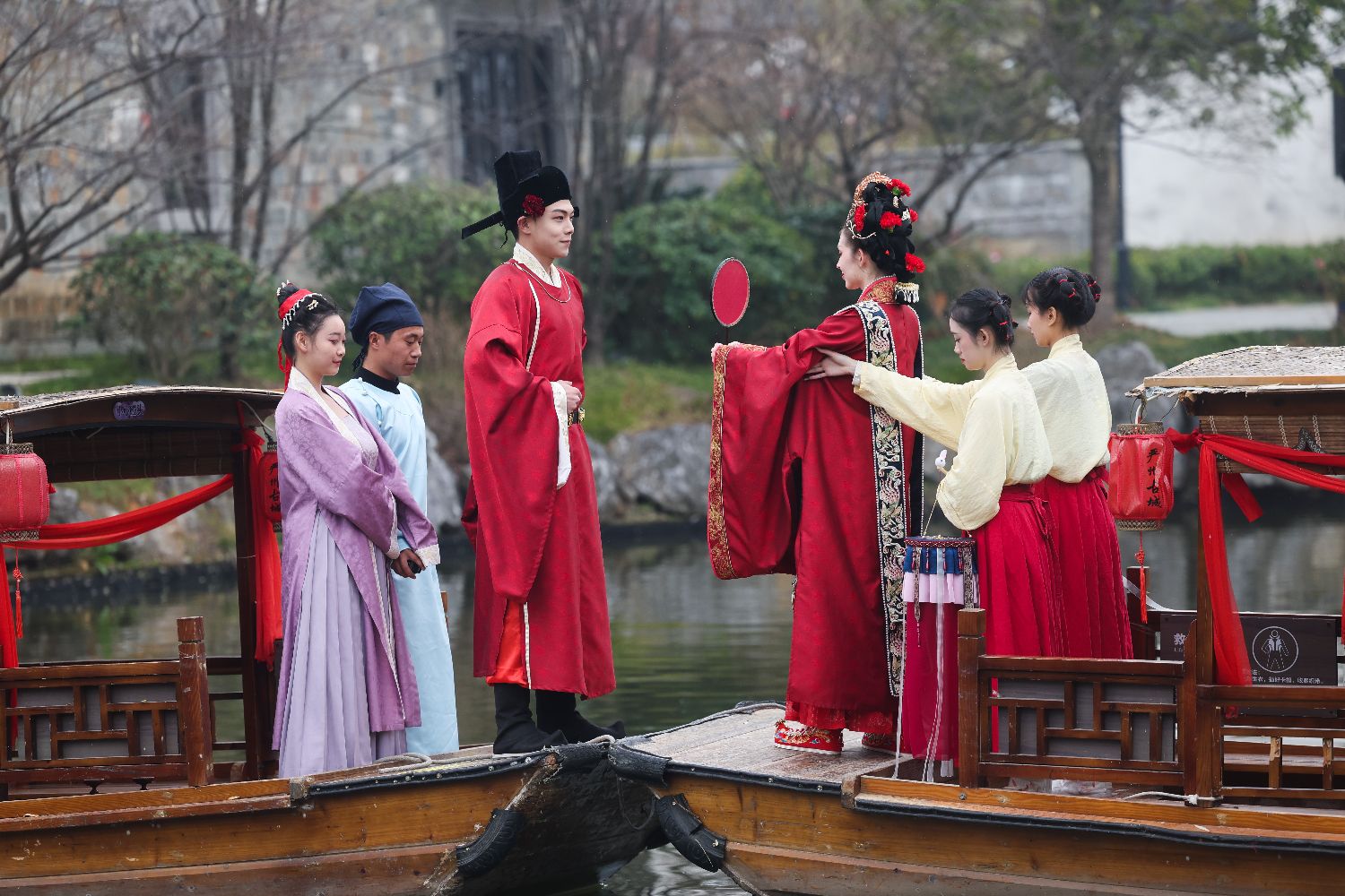 1月18日,中外青年身着传统服饰在建德严州古城的船上体验传统水上婚礼习俗,包括出阁、梳妆、登船、亲迎、礼拜等多个环节。