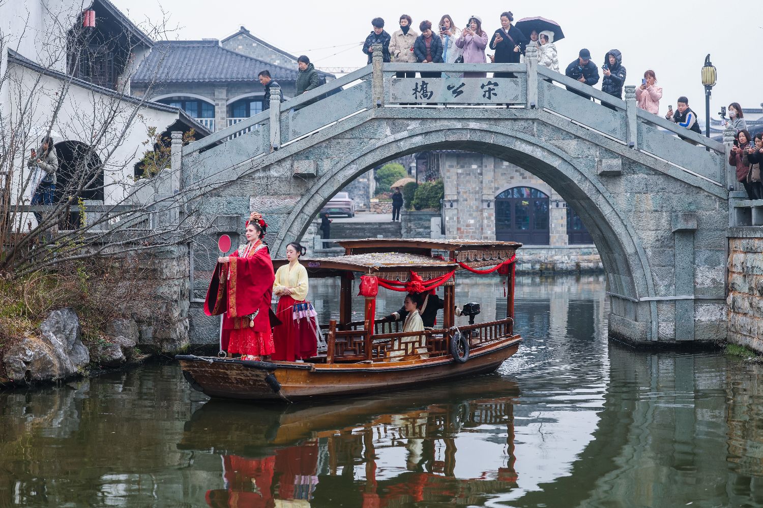 1月18日,中外青年身着传统服饰在建德严州古城的船上体验传统水上婚礼习俗,包括出阁、梳妆、登船、亲迎、礼拜等多个环节。(图片来源:本文图片均据新华社)