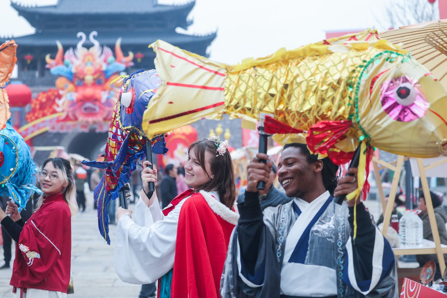 1月18日,中外青年身着传统服饰在建德严州古城宋韵集市上体验传统鱼灯。