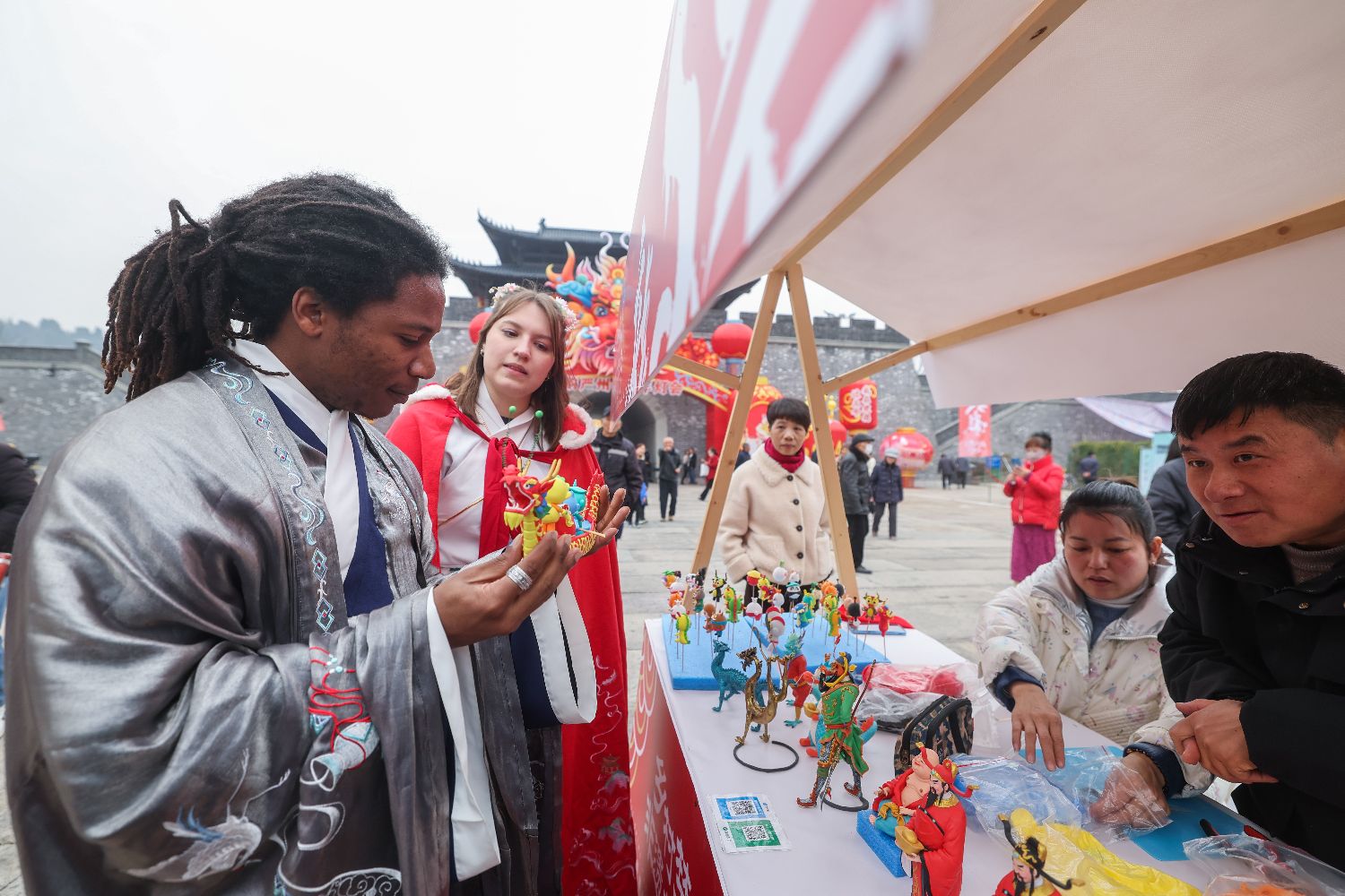 1月18日,中外青年身着传统服饰在建德严州古城宋韵集市上观看传统米塑工艺品。