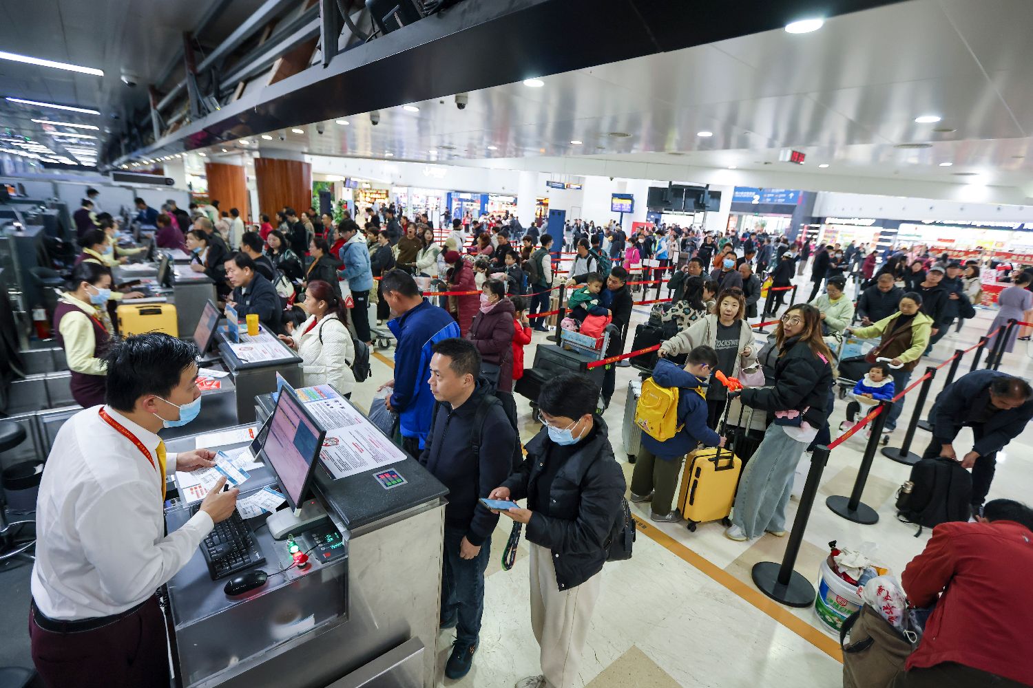 图为旅客在海口美兰国际机场T1航站楼排队办理值机。(图片来源:中新社)