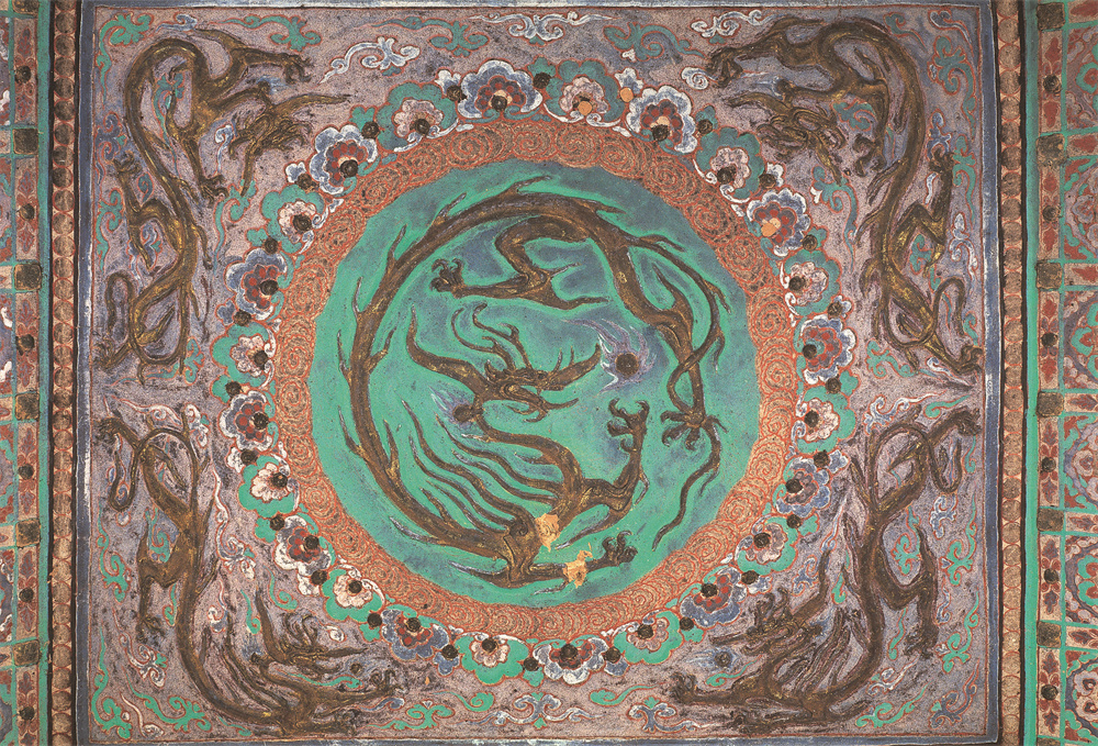 龙,在中华民族传统意涵中,是神灵的化身,寓意吉祥。在敦煌壁画中也有乘龙或龙车升天的仙人图像。龙在佛教石窟中的地位,最初颇为低下,其图案多绘塑在佛龛两侧,即“龛梁龙”,是重要的护法神,起到护卫、装饰的作用。随着时间推移,佛教石窟中的龙逐步向居于石窟中心位置的“盘柱龙”,和居于窟顶的“藻井龙”过渡。