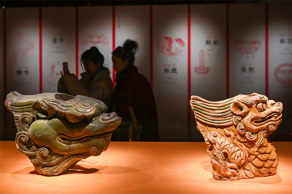 2024年1月,在南京市博物馆展出的明代龙纹琉璃构件(右)、绿釉龙纹琉璃构件。(图片来源:中新社)