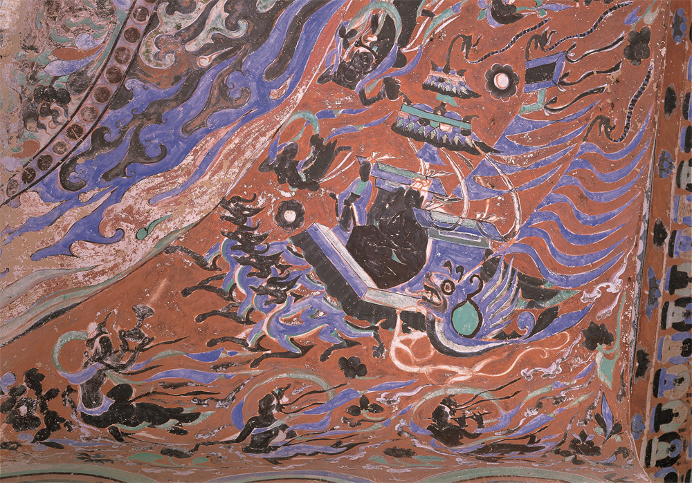 莫高窟第401窟西壁佛龛顶北侧帝释天乘四龙车。(图片来源:敦煌研究院供中新社)