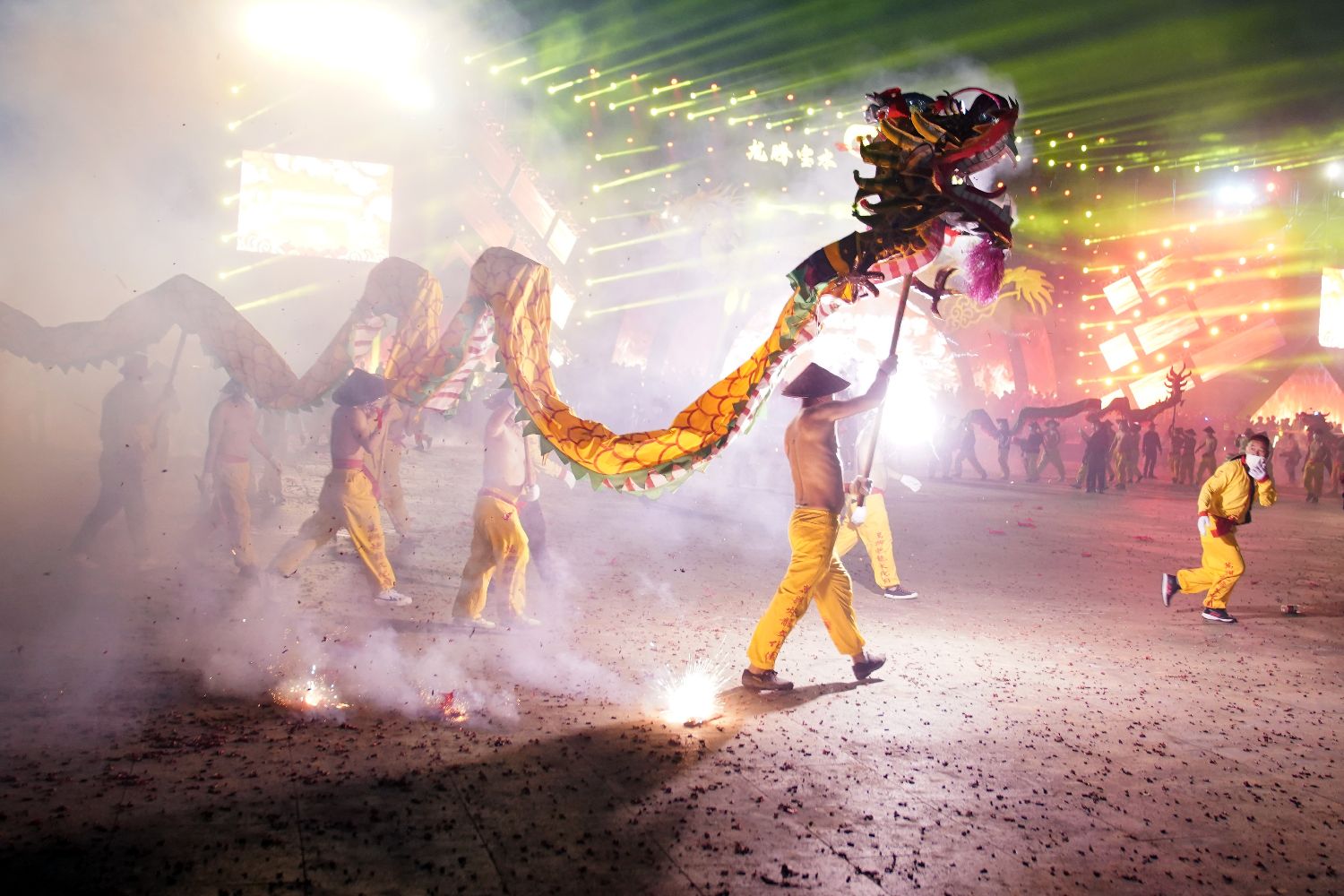当晚18时58分,百龙舞宾州活动开始。一条条游龙汇聚庙堂,待族上长者完成炮龙开光仪式后,锣鼓喧天,万炮齐鸣。一条条巨龙上下腾挪,走街串巷送祝福,数十万游客与龙共舞,蔚为壮观。
