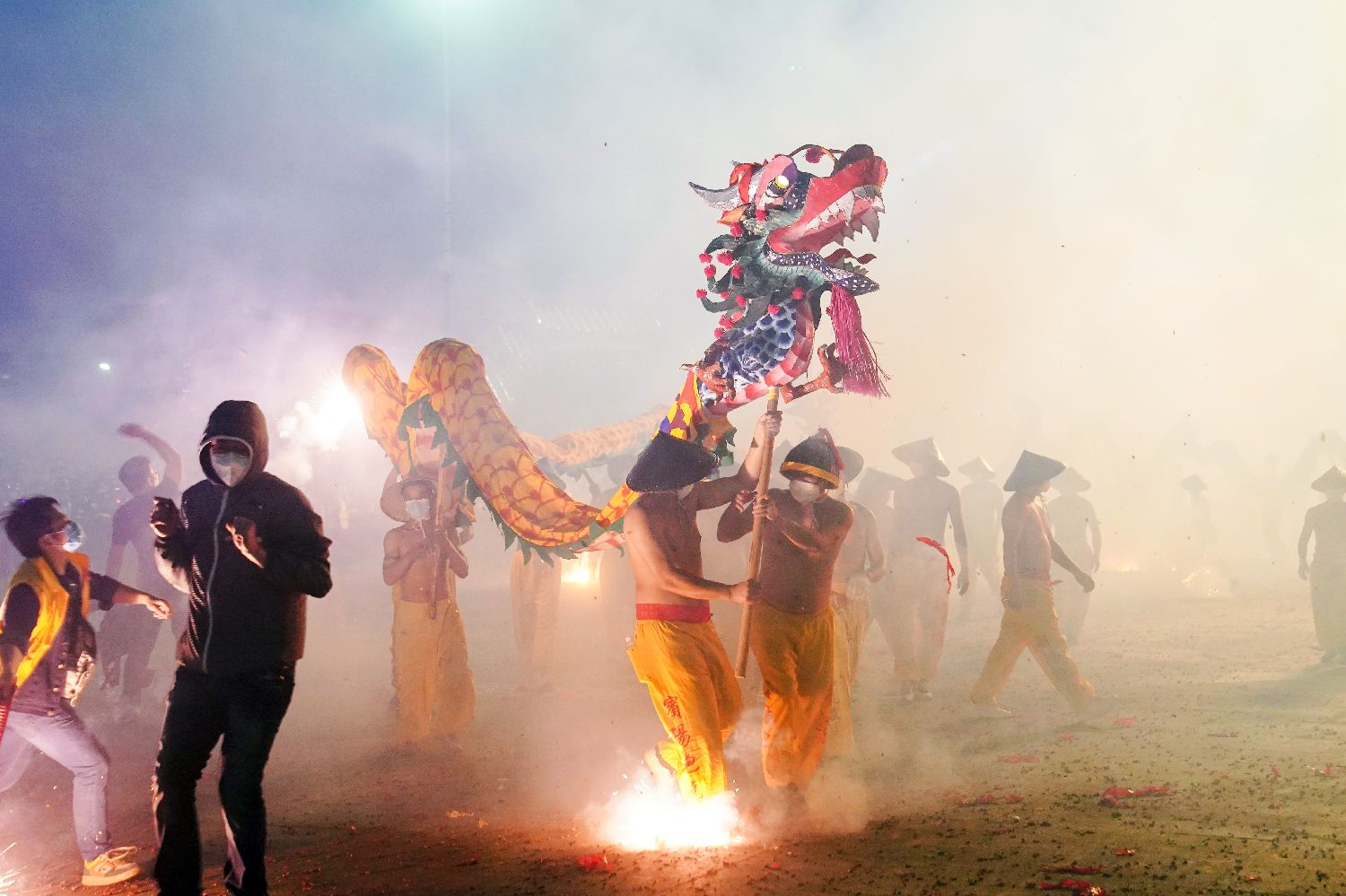 活动现场,只见舞龙人头戴竹帽、赤膊上阵,挥舞着龙头龙身,进行“勇敢者的游戏”,任凭爆竹炸响弹落。大胆的游客脖上挂着数串鞭炮,点燃了一串又一串,玩得兴致勃勃。不少人还“冒险”钻龙肚、拔龙须、抓龙鳞,以求福气。