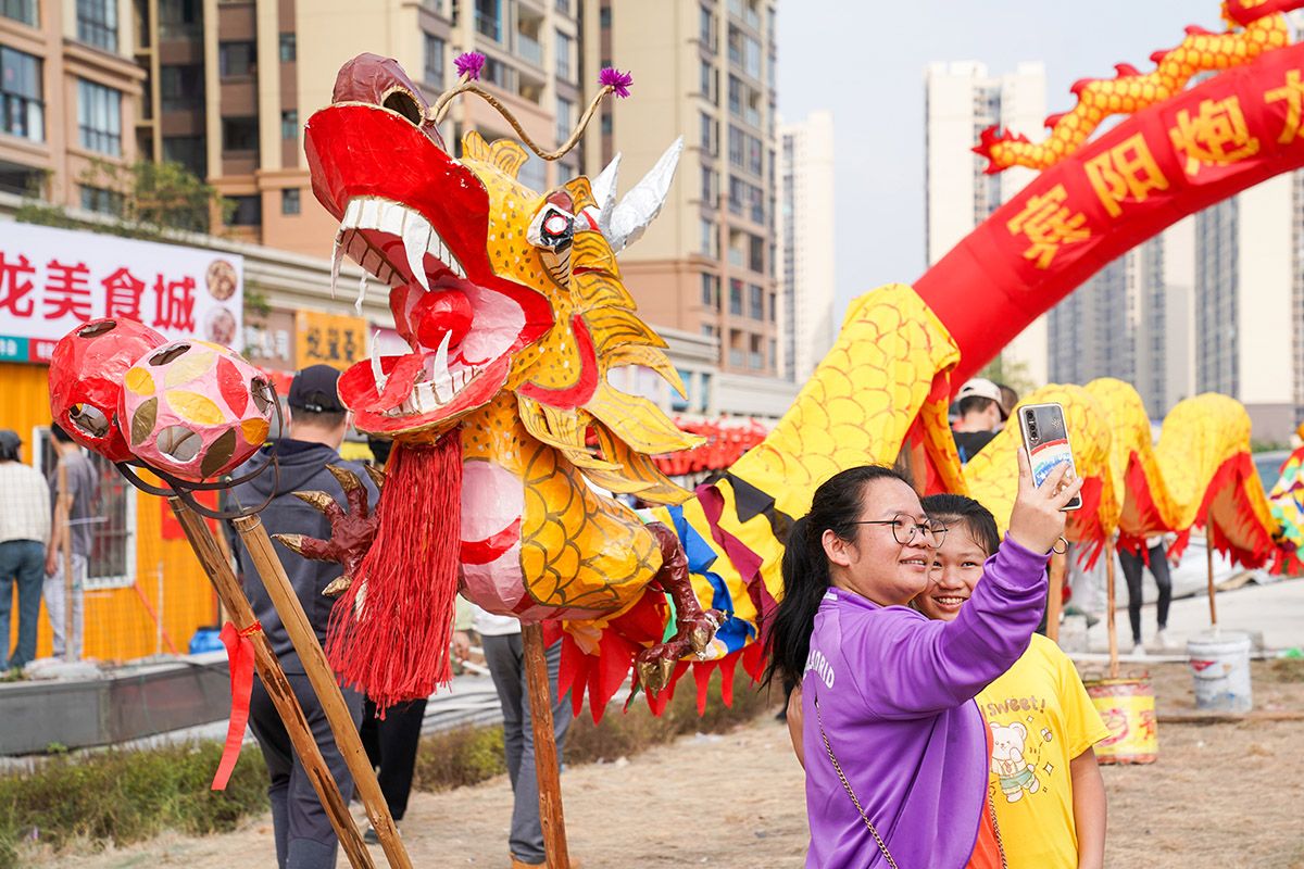 2月20日,在广西南宁市宾阳县,游客与炮龙合影。(图片来源:中新社)