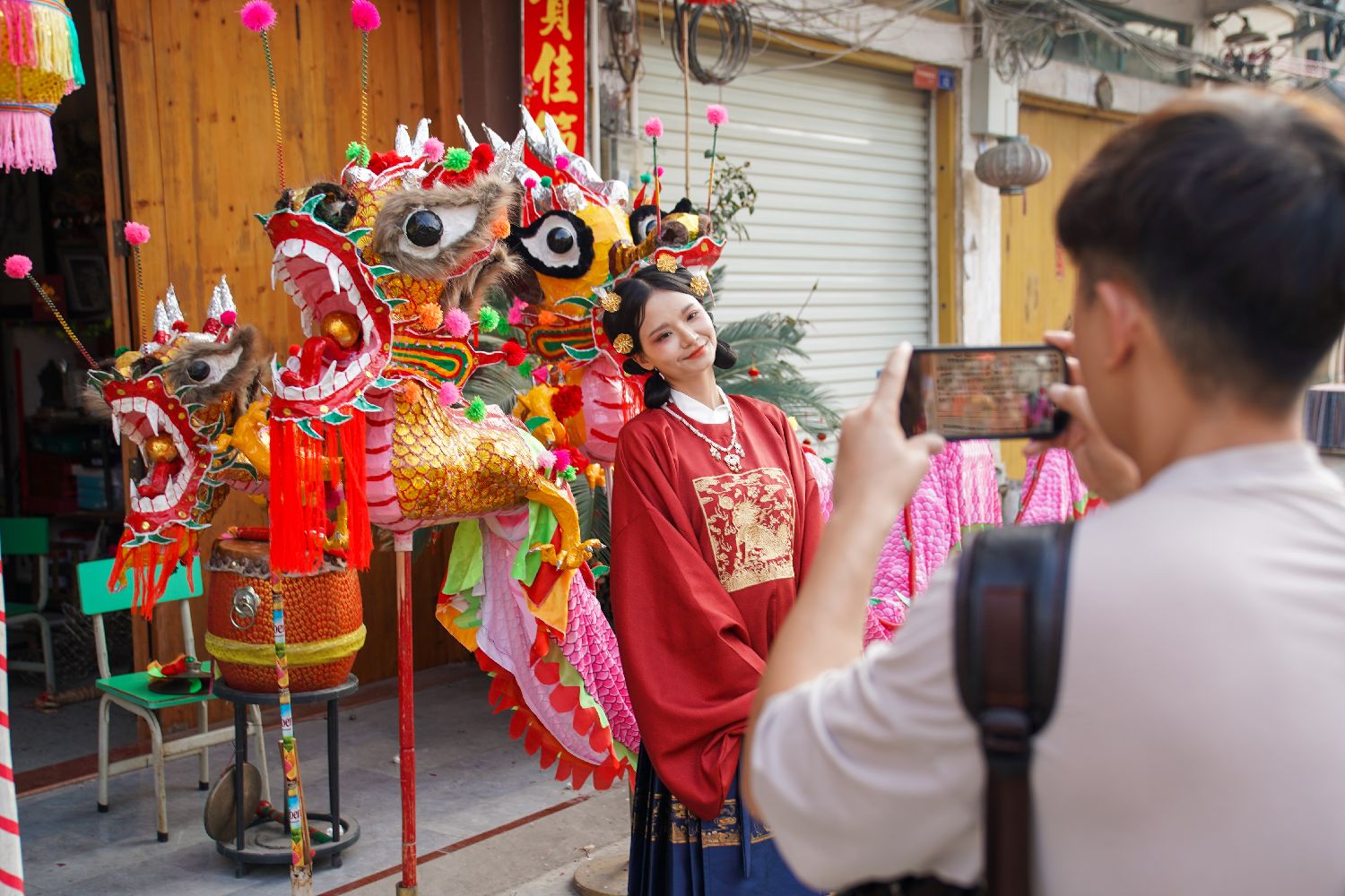 2月20日,在广西南宁市宾阳县,博主曾月珊与同伴在拍摄炮龙文化短片。(图片来源:中新社)