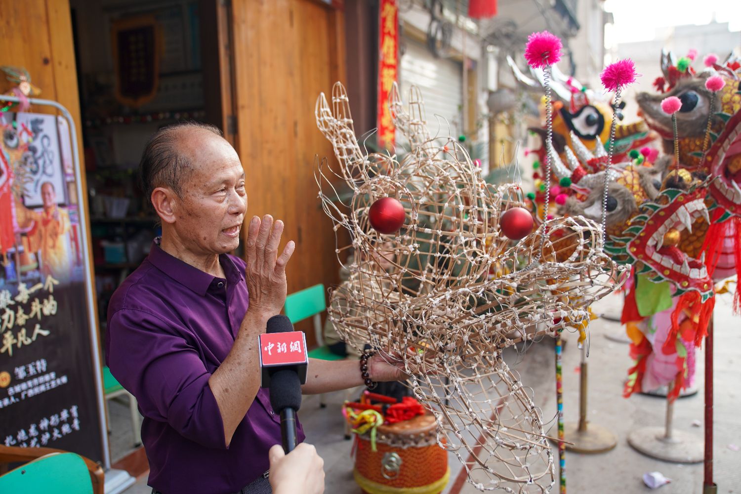 2月20日,在广西南宁市宾阳县,扎龙老匠人邹玉特向中新社记者介绍炮龙制作工序。(图片来源:中新社)