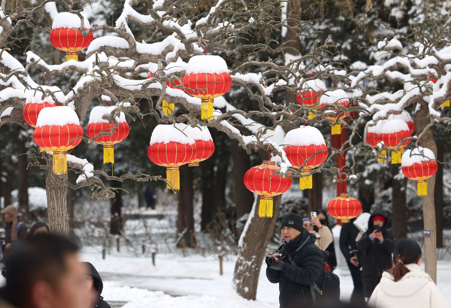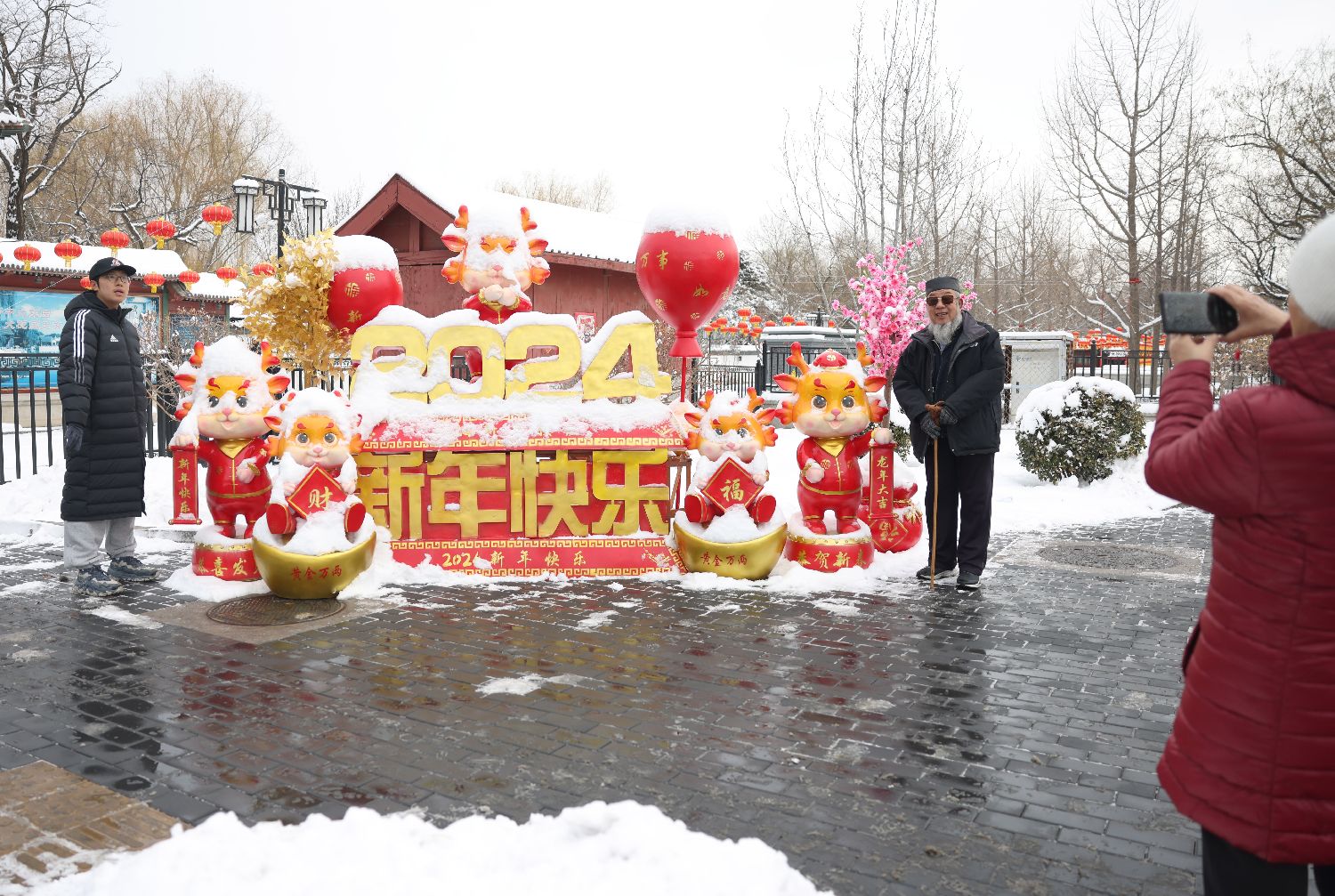 2024年2月21日,北京街头春节装饰落满雪花,吸引市民合影。(图片来源:本文图片均由欧洲时报特约记者卞戈摄)