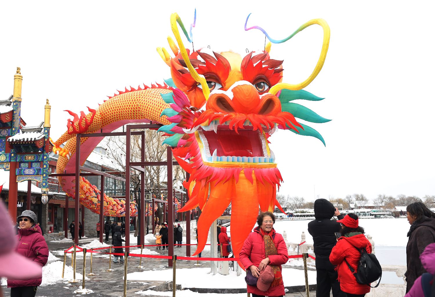 2024年2月21日,龙年初雪过后,北京什刹海畔,白雪掩映着巨型龙灯,尽显节日氛围。