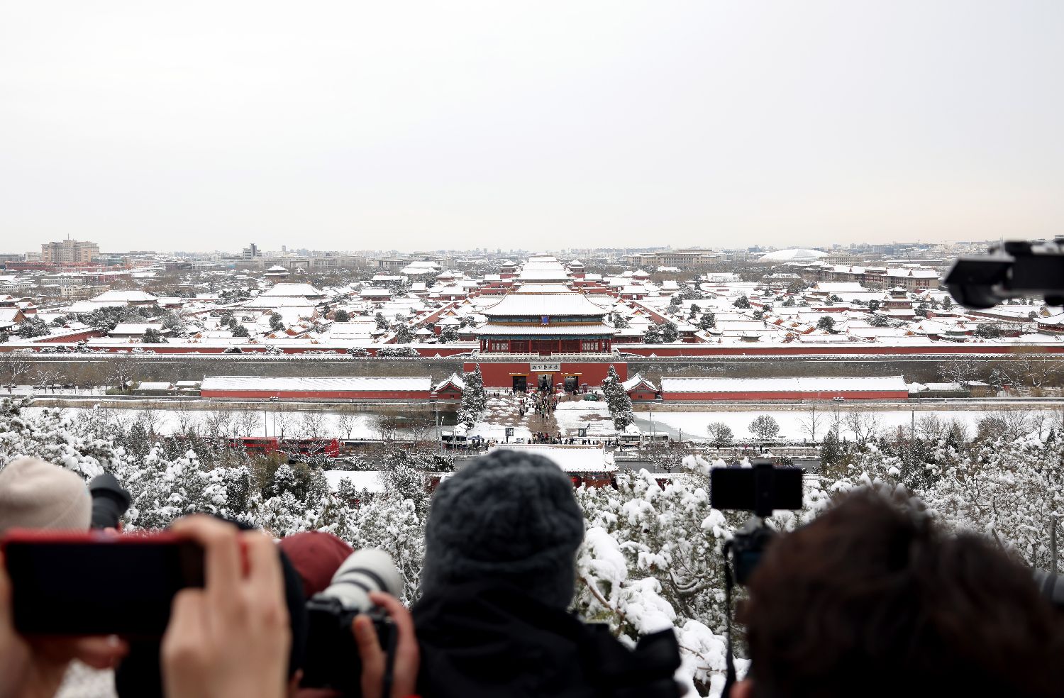 2024年2月21日,游客站在北京景山远眺故宫雪景。20日傍晚,北京城区迎来甲辰龙年第一场降雪,雪后北京城一片银装素裹,尽显古都神韵。