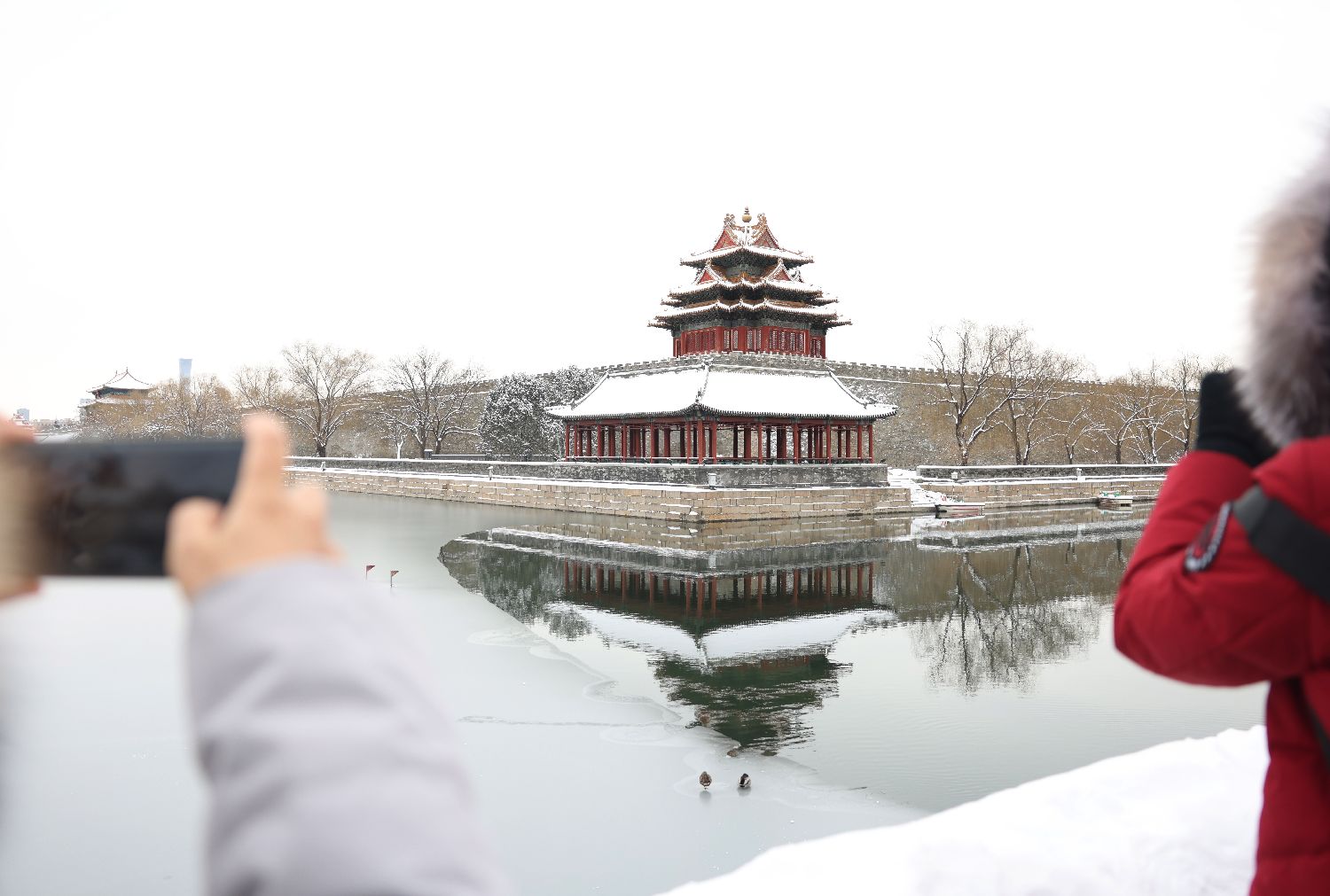 2024年2月21日,雪后北京故宫角楼游客引游人拍摄。