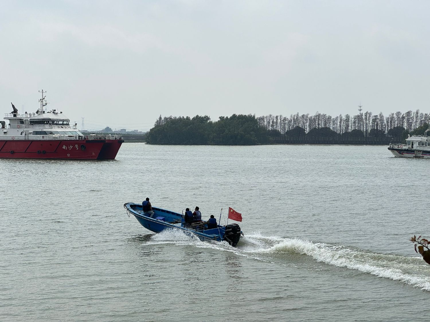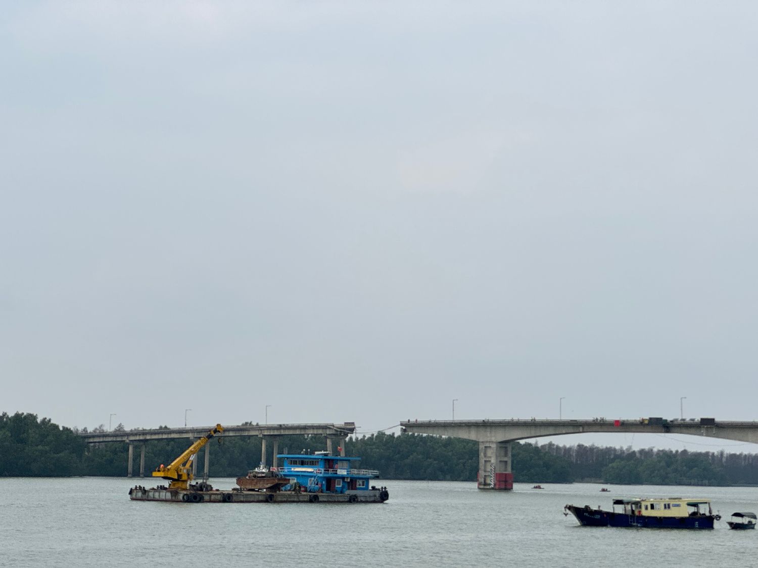 当日上午,记者在事故现场看到,洪奇沥水道已实施水上交通管制,大桥两侧路面也进行封控。记者在一处靠近大桥的岸堤边看到,大桥桥面明显断裂,洪奇沥水道的水面上有多条救援船在开展救援工作,搭乘着救援人员的快艇在水面穿梭。