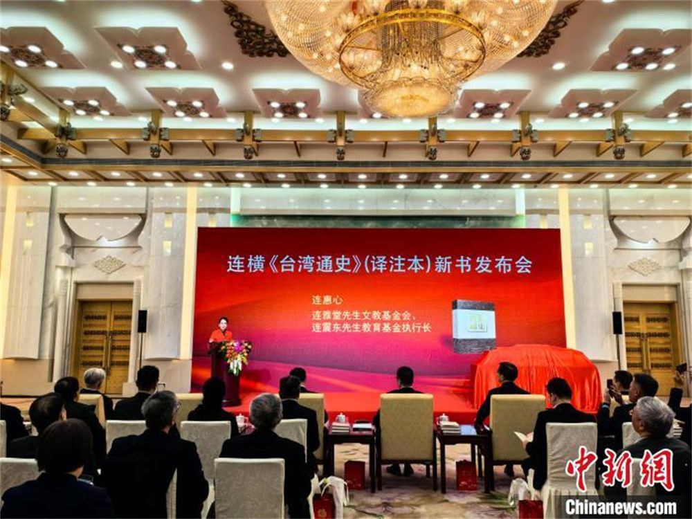 香港中通社报道,闽台历史文化研究院、海峡出版发行集团当天在北京人民大会堂台湾厅举行连横《台湾通史》(译注本)新书发布会。连惠心在会上代读连战的贺函。贺函指出,《台湾通史》体现两岸一脉相传的历史渊源,承载对家乡台湾的深厚情感,与维护中华民族精神的毕生心志。