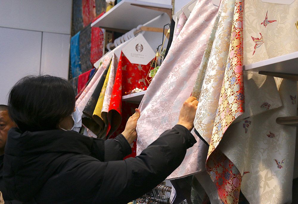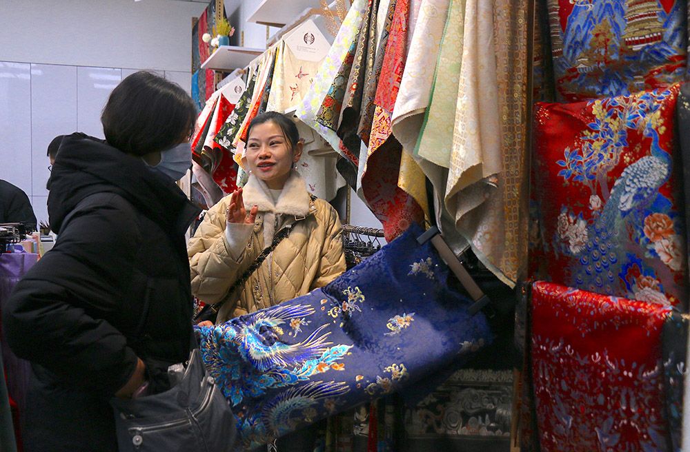 2024年2月底,批发商挑选新款马面裙面料。(图片来源:中新社)