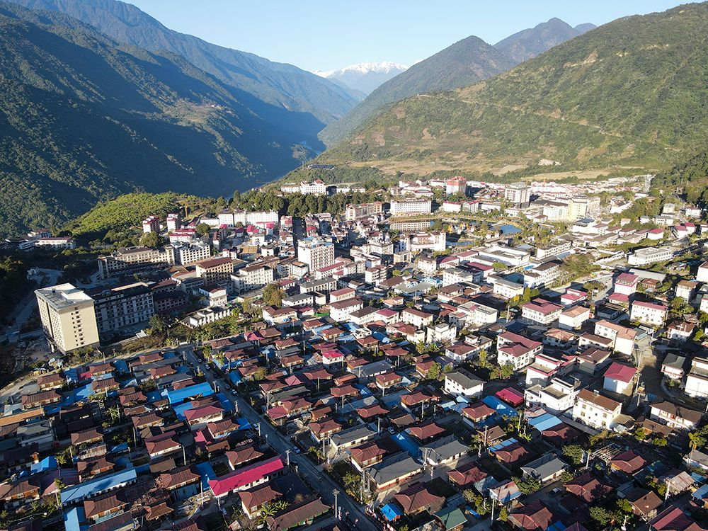 2023年12月19日,西藏自治区林芝市墨脱县全貌,画面下方区域即为墨脱村。(无人机画面)(图片来源:中新社)