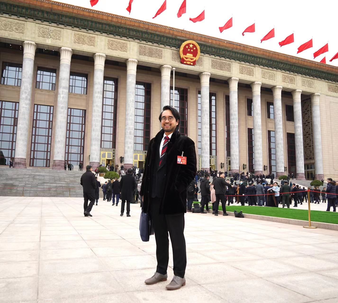2024年全国两会期间,港区全国政协委员郑志刚在人民大会堂外。(图片来源:受访者供中新社)