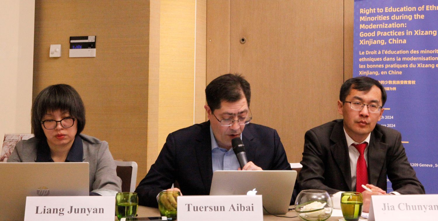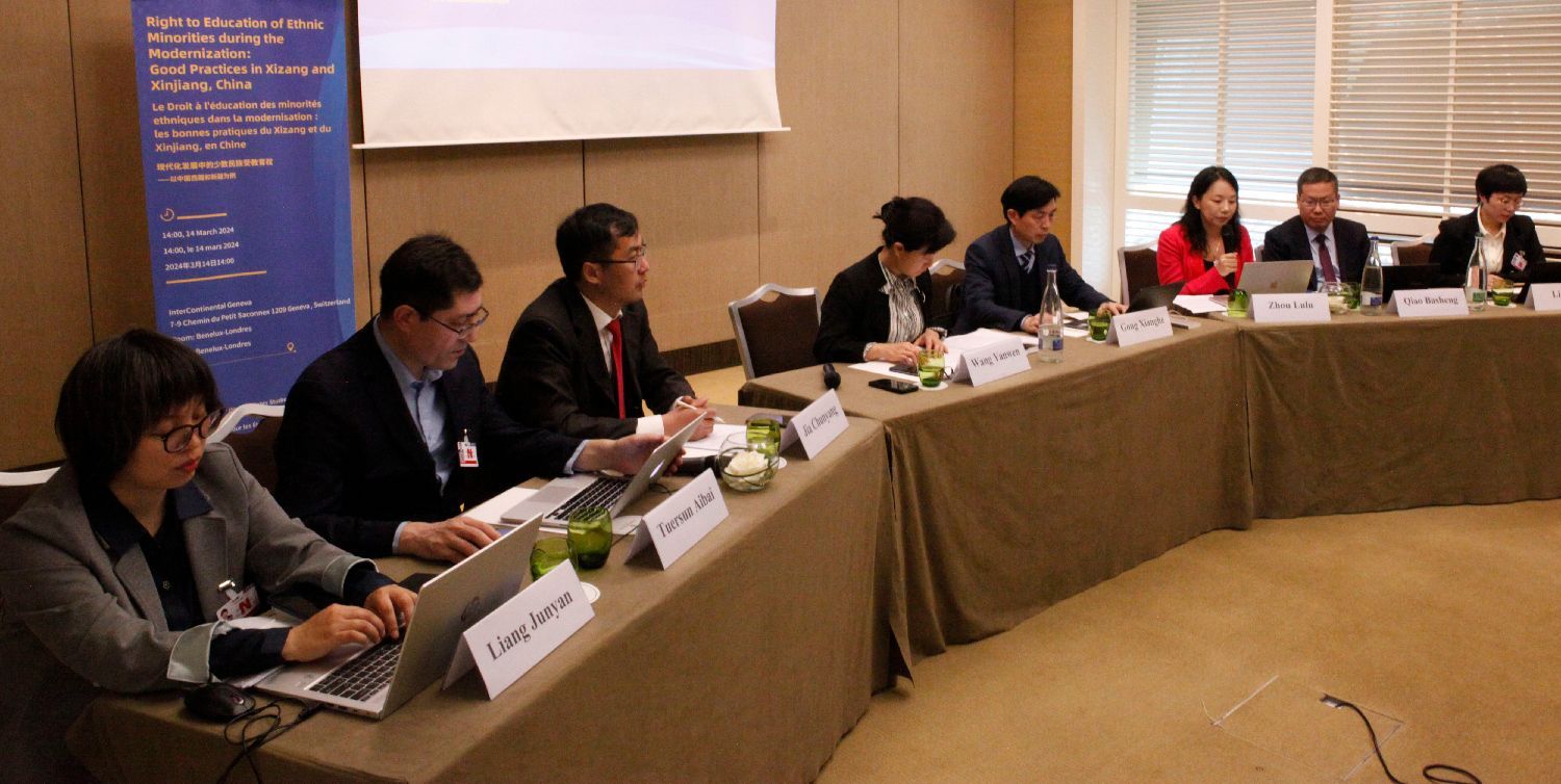 联合国人权理事会第55届会议期间,中国人权研究会当地时间14日在瑞士日内瓦举办“现代化发展中的少数民族受教育权——以中国西藏和新疆为例”主题边会。图为中国人权研究会副秘书长王琰文(图左)主持边会。(图片来源:本文图片均自中新社)